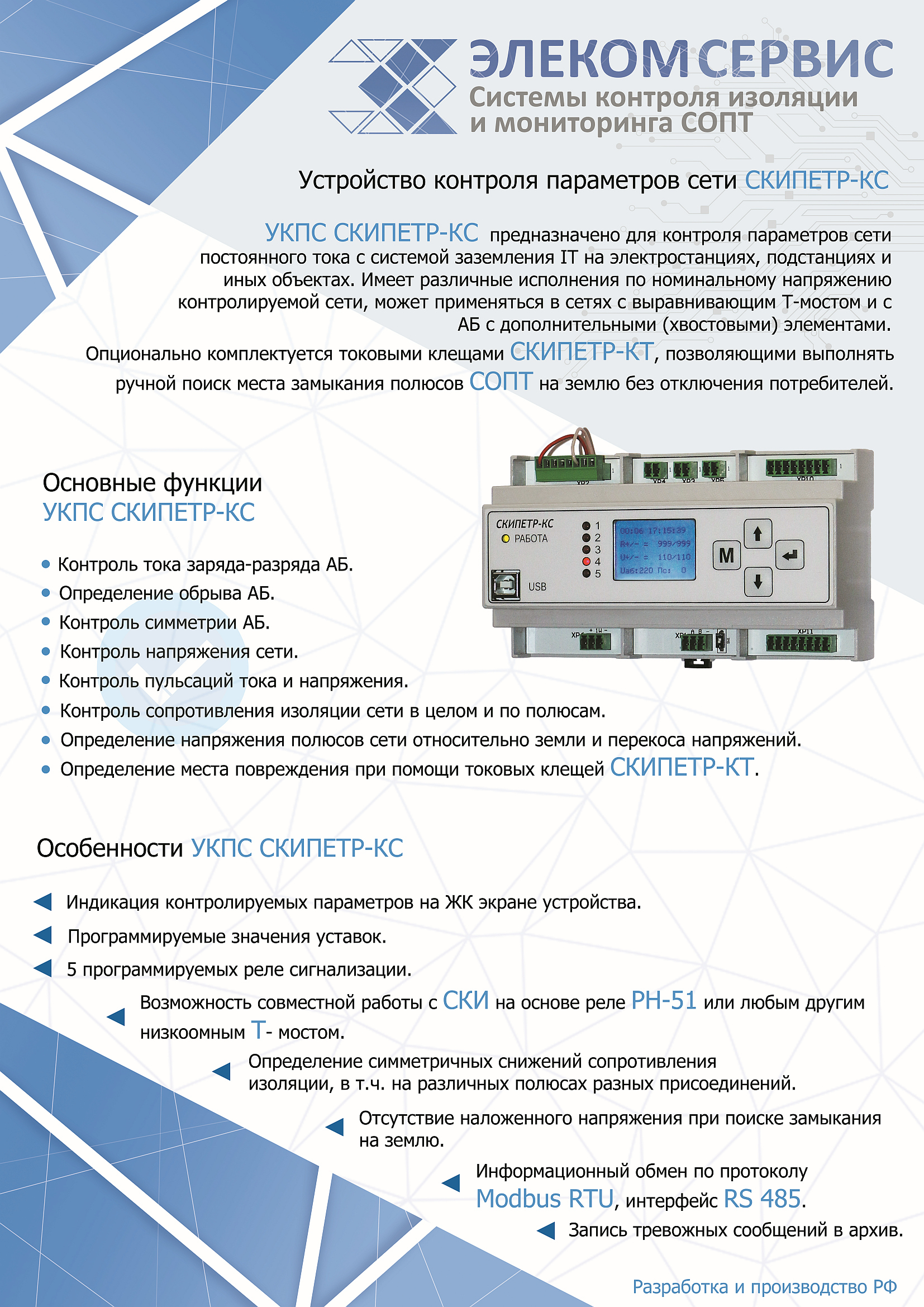 УКПС СКИПЕТР-КС - универсальное решение для организации мониторинга параметров сети постоянного тока с системой заземления IT на электростанциях, подстанциях и иных объектах.